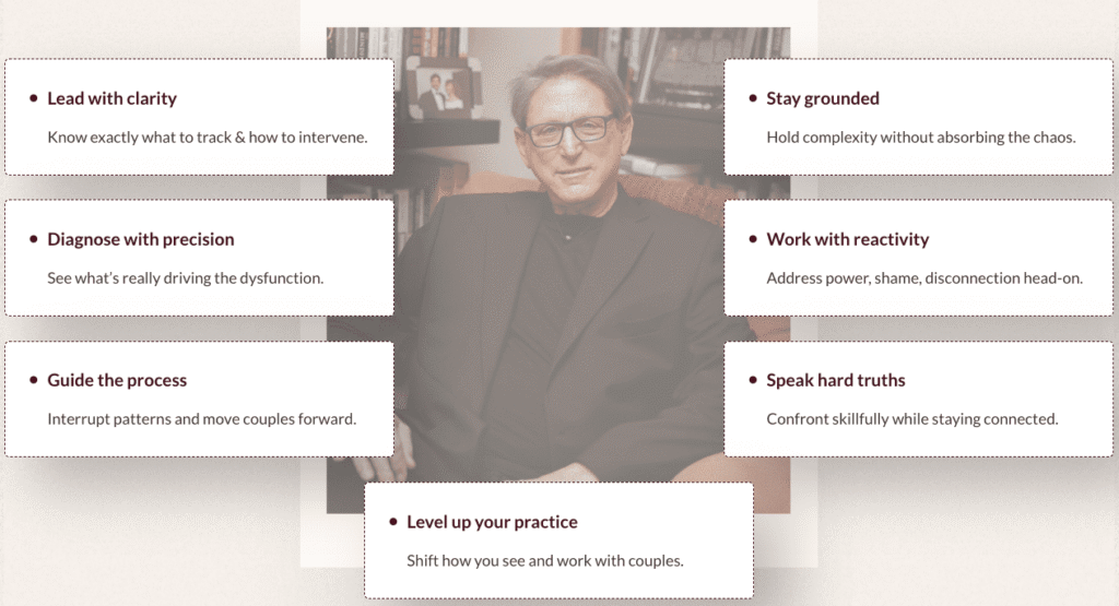You’ll explore the theory behind RLT, along with some of the effective tools and strategies that move couples toward meaningful change.